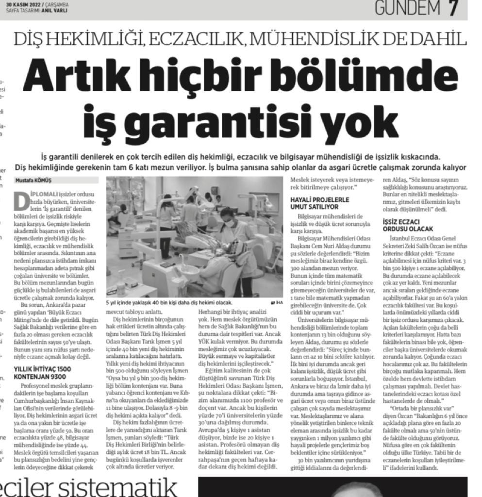 Birgün Gazetesi'nin 30 Kasım 2022 tarihli haberine göre iş garantili denilerek en çok tercih edilen dişhekimliği, eczacılık ve bilgisayar mühendisliği de işsizlik kıskacında. Dişhekimliğinde gerekenin tam 6 katı mezun veriliyor. İş bulma şansına sahip olanlar da asgari ücretle çalışmak zorunda.