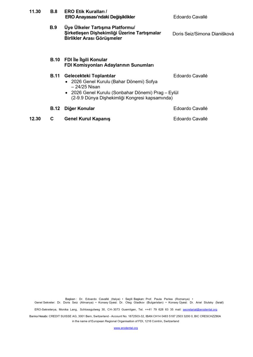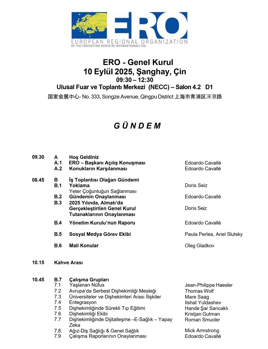 Dünya Dişhekimleri Birliği`ne (FDI) bağlı ve 48 ülkenin üyesi olduğu Bölgesel Avrupa Dişhekimleri Birliği Organizasyonu (ERO)`nun 2025 yılı, Sonbahar dönemi Genel Kurulu, 10 Eylül 2025 tarihinde Şanghay / Çin’de gerçekleşti.