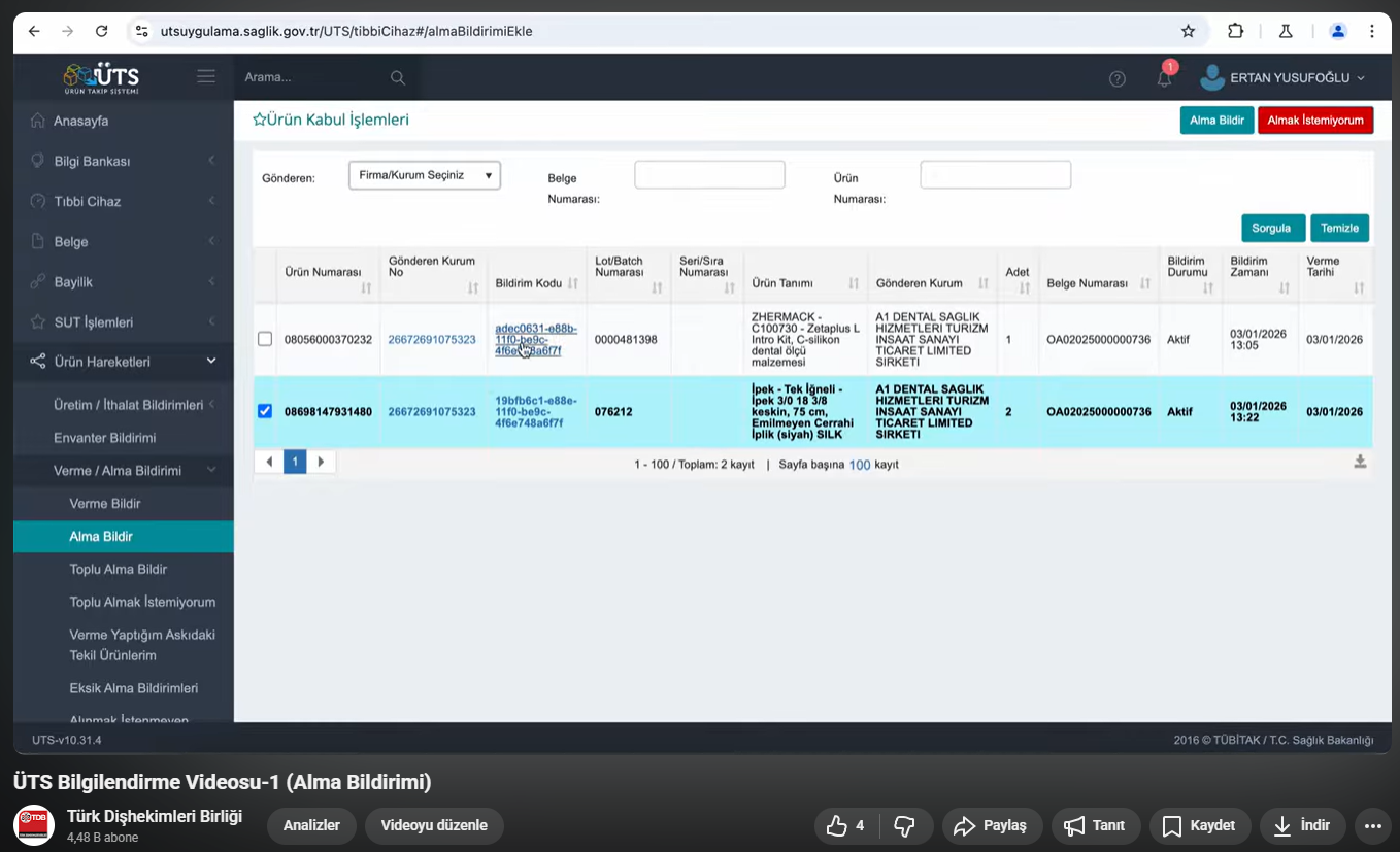 2. Alma Bildirimi: Dental depolardan alınan her türlü tıbbi cihazın (özellikle tekil takibi yapılan implant gibi ürünlerin) sistem üzerinden "alma bildirimi" yapılarak stoklara dahil edilmesi gerekir.