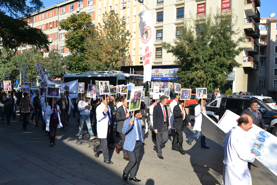 Sağlık Bakanlığı’nın açtığı davaya karşı çıkmak, “hekimliğe dokunma” demek, hekimlik mesleğinin evrensel değerlerini savunmak ve mesleklerine sahip çıkmak isteyen hekimler, sabah saatlerinde TTB Merkez Konseyi binası önünde toplandıktan sonra, davanın görüleceği Ankara Adliyesi’ne doğru yürüyüşe geçtiler. Yürüyüşe; Türkiye’nin dört bir yanından tabip odası temsilcileri, TTB Tıp Öğrencileri Kolu, uzmanlık dernekleri temsilcileri, sağlık emek ve meslek örgütleri, akademik meslek birlikleri ve sendikalardan çok sayıda temsilci, avukatlar, milletvekilleri ve uluslararası sağlık meslek kuruluşlarından temsilciler destek verdi.