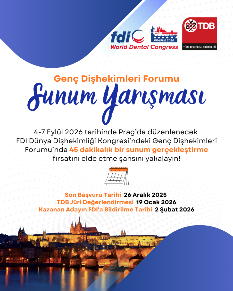 4-7 Eylül 2026 tarihinde Prag’da düzenlenecek FDI Dünya Dişhekimliği Kongresi’ndeki Genç Dişhekimleri Forumu’nda 45 dakikalık bir sunum gerçekleştirme fırsatını elde etme şansını yakalayın!